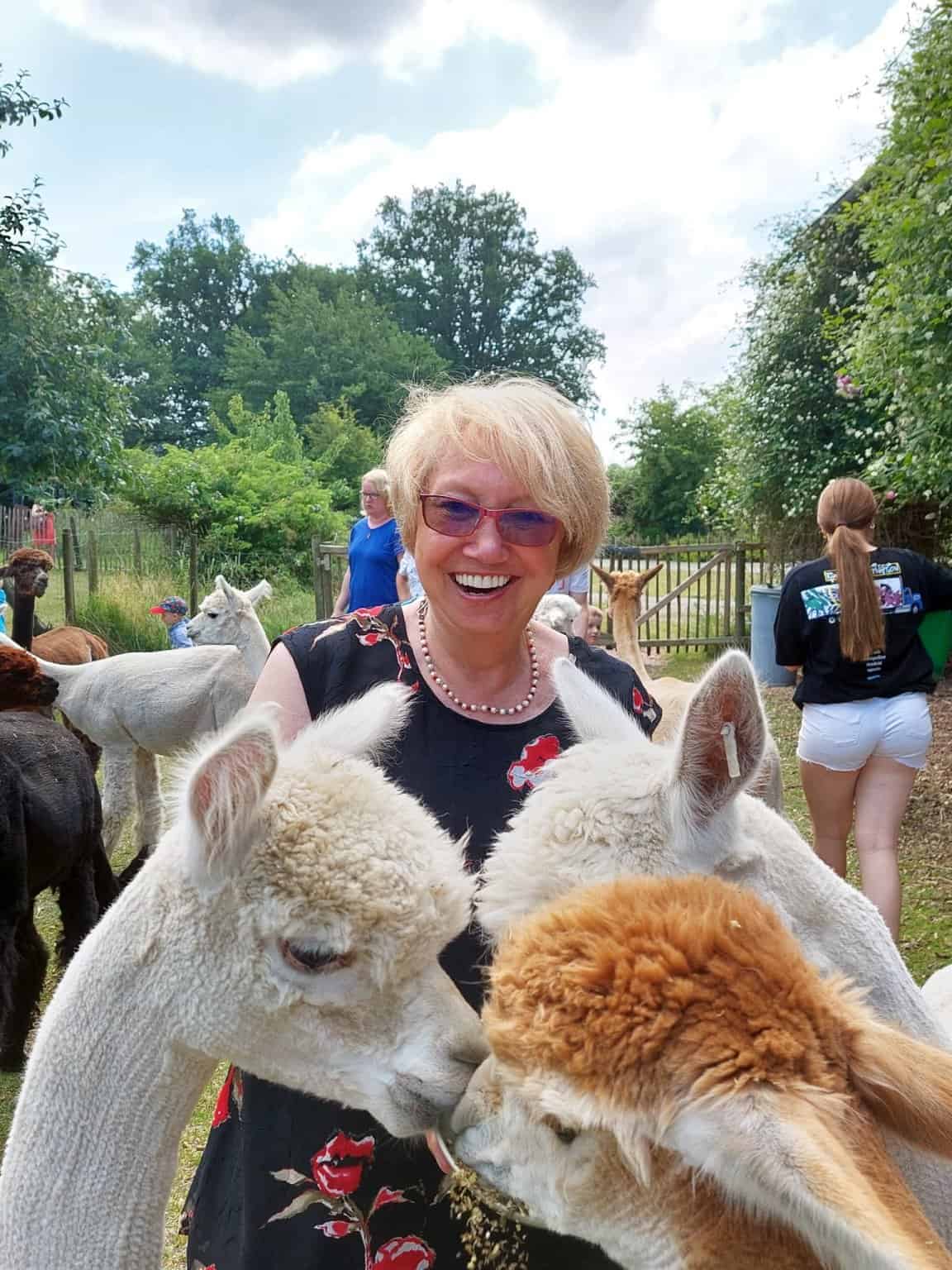 Die Vorsitzende der HKH umringt von Alpakas