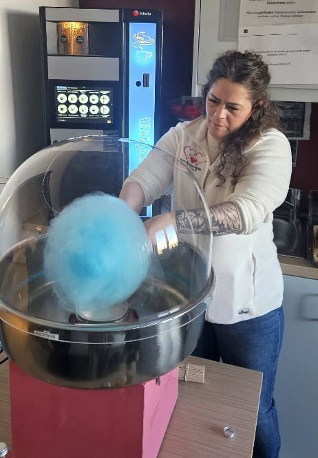 Das absolute Highlight in diesem Jahr war unsere Zuckerwattenmaschine: Bunte, frisch gedrehte Zuckerwatte, bei der sich jedes Kind den Geschmack selbst aussuchen durfte. Welch ein strahlendes Glück in den Kinderaugen! Auch ein kleiner, selbstgebackener Keks brachte große Freude und sorgte für lachende Gesichter sowie herzliche Umarmungen – ein kleines Stückchen Glück mit großer Wirkung.