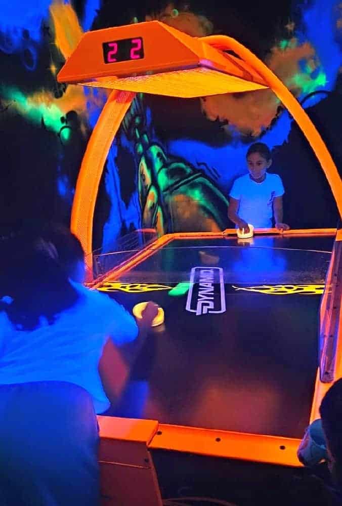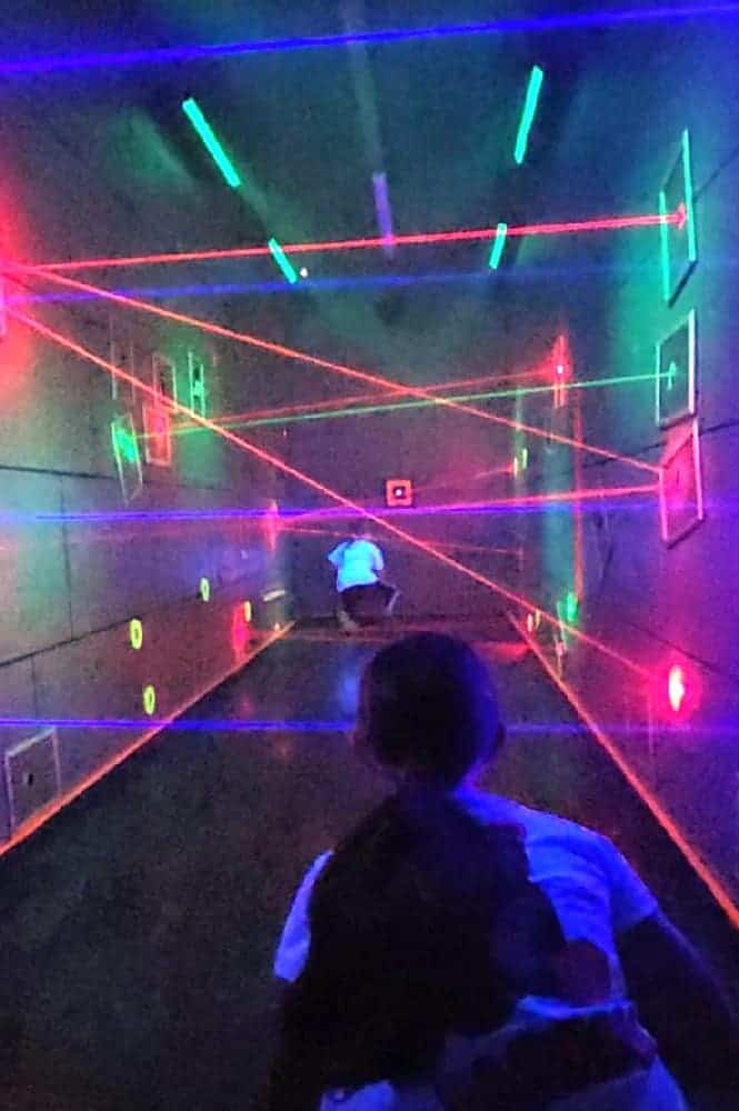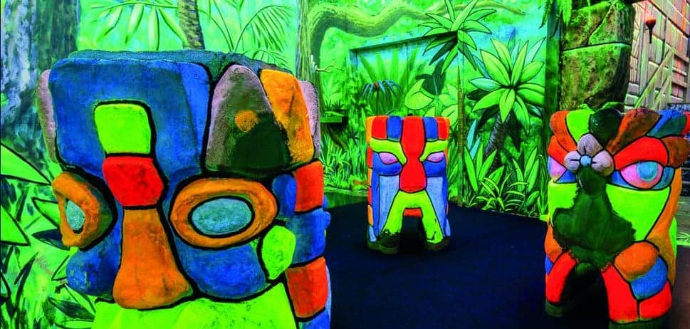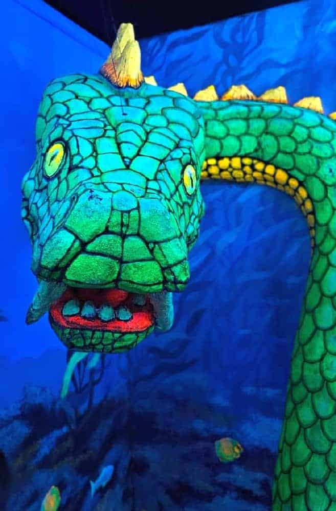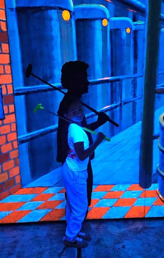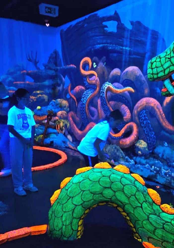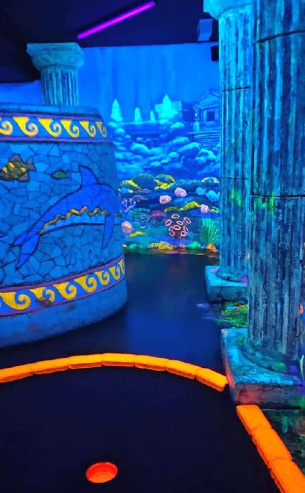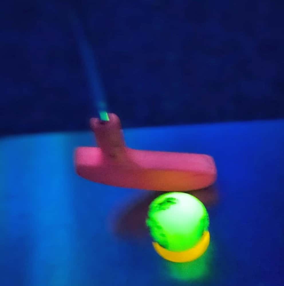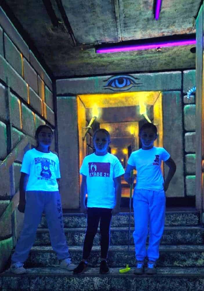 Anfänglich wurden wir „mit einem Seemann“ in die Unterwasserwelt per U-Boot gefahren und schon dann standen wir mittendrin in einem Meer von Neonfarben. Selbst der Golfball ist am Leuchten gewesen. In Kleingruppen haben wir uns zusammen durch den Parcours bewegt und so manches Mal war es für die Kleinsten, die dabei waren, auch etwas mulmig unter den großen leuchtenden Seeungeheuern den Ball einzulochen. So dass wir um jede Ecke erst Mal vorsichtig schauten, um einschätzen zu können, in welcher Meereswelt die nächste Bahn wohl liegen mag. Einige der Teilnehmer hatten sich extra weiße Kleidung angezogen, um mit den Fischen um die Wette zu leuchten. Ein absolutes Highlight war die Bahn, bei der der Golfball per Katapult in ein Labyrinth geschossen wurde.